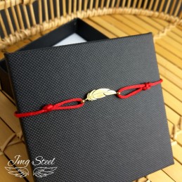Bransoletka z czerwonego sznurka ze złotym piórkiem.