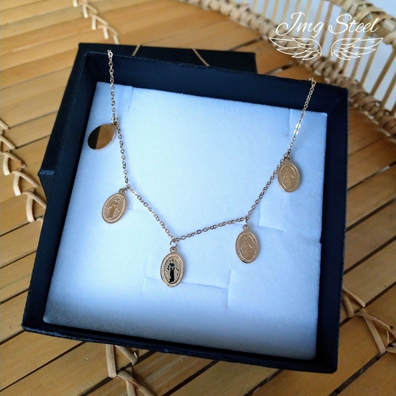 Delikatny łańcuszek z pięcioma medalikami.