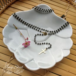 Bardzo modny w tym sezonie naszyjnik różaniec z czarnymi koralikami.