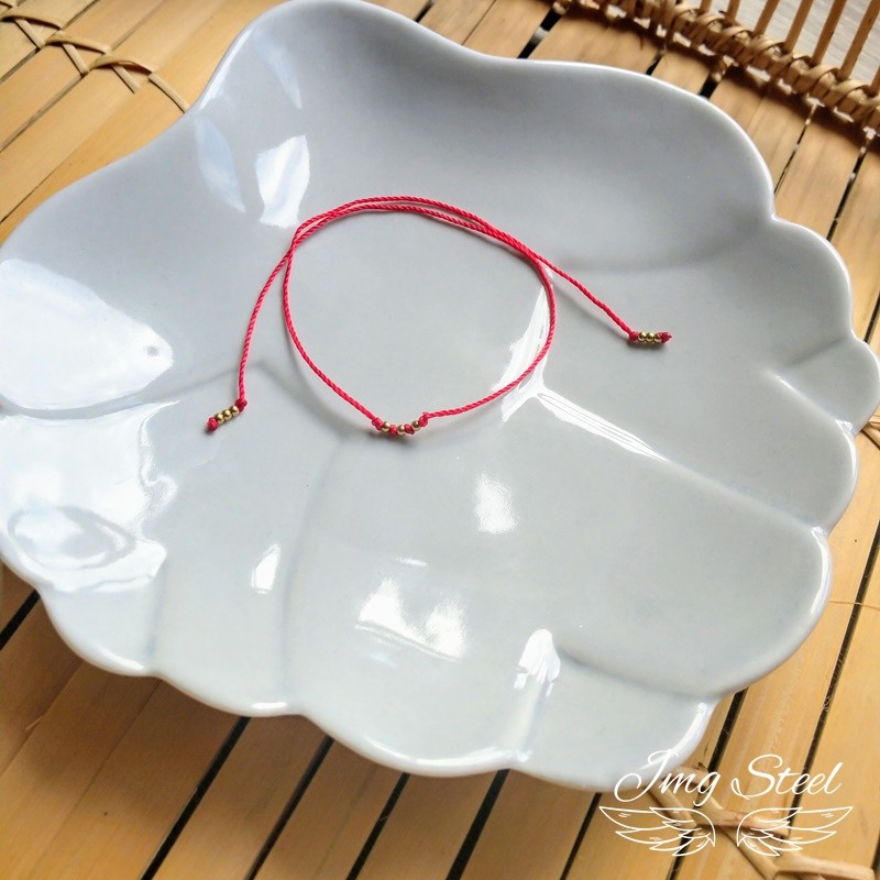 Czerwona bransoletka do samodzielnego wiązania wykończone złotymi koralikami koralikami.