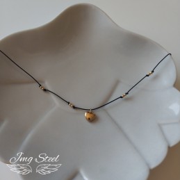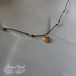 Delikatny naszyjnik ze sznurka z serduszkiem i złotymi kuleczkami.