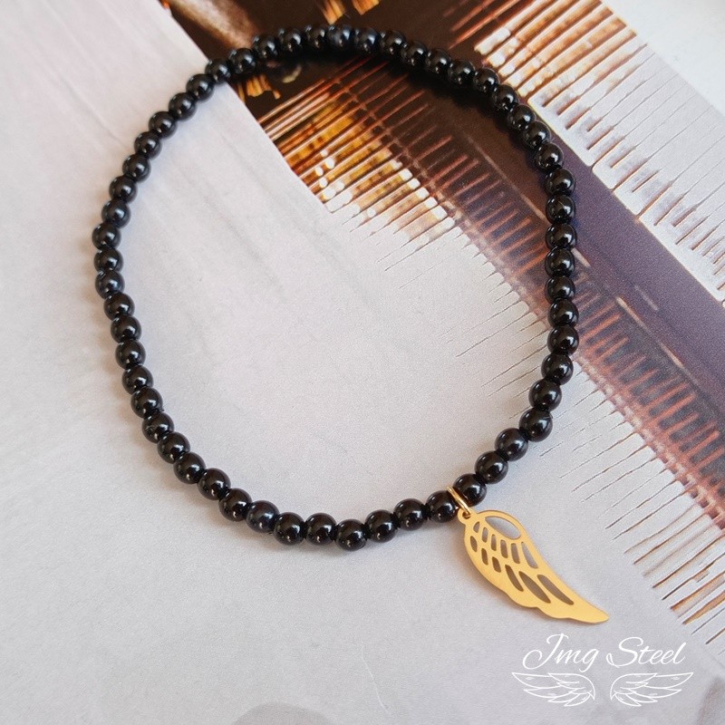 Bransoletka na gumce z czarnymi koralikami i stalowym skrzydłem.