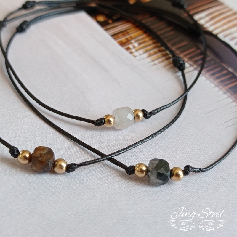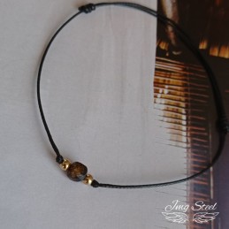 Bransoletka wykonane z czarnego sznurka z brązowym kamieniem oraz kuleczkami ze stali chirurgicznej 316L.