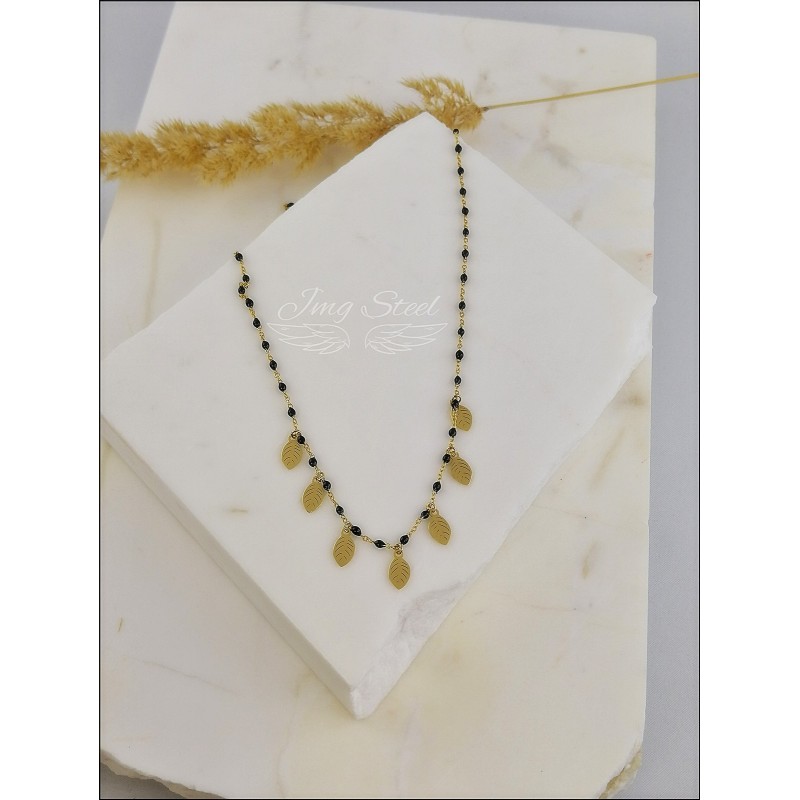 Niezwykle kobiecy złoty łańcuszek z listkami, oraz czarnymi koralikami co sprawia, że jest on elegancki a zarazem delikatny.